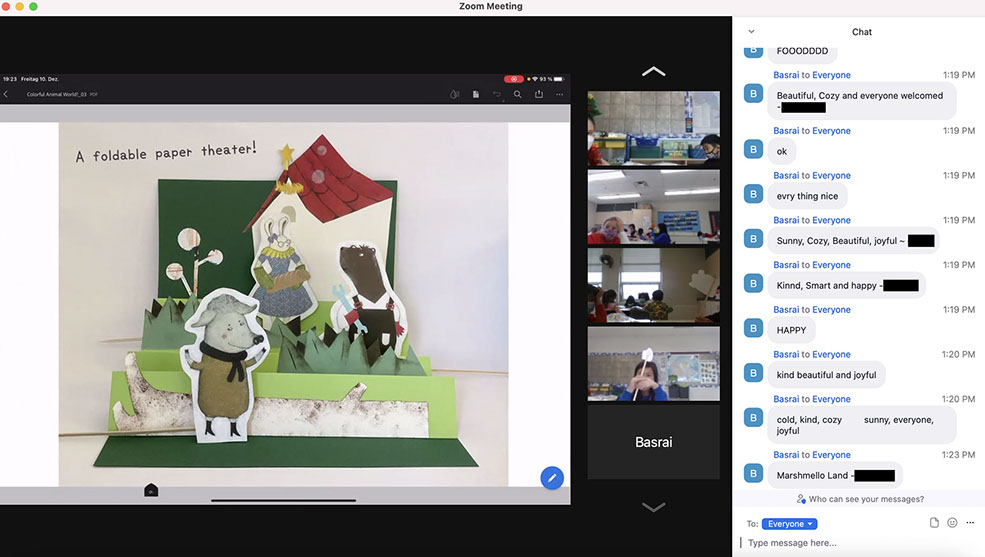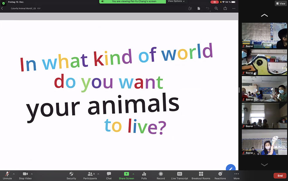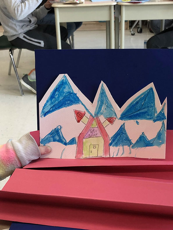 Students discussed what kind of world they would like to live in, and were asked to think about the unique needs and preferences of each of their animals as they imagined an environment in which all could live happily and comfortably. They then created this environment as a foldable paper puppet theatre where all their animals could play and have adventures together.